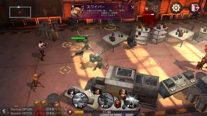 基本的な攻撃は自動ででき、下にあるスキルをマップにスワイプでセントリーガンの配置や手榴弾、ドラム缶での足止めなどができます。