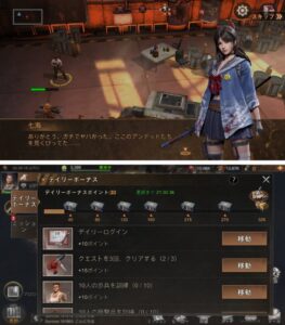 拠点画面の左下では、ガイドミッションがあって、それにしたがって達成し進行させる。
